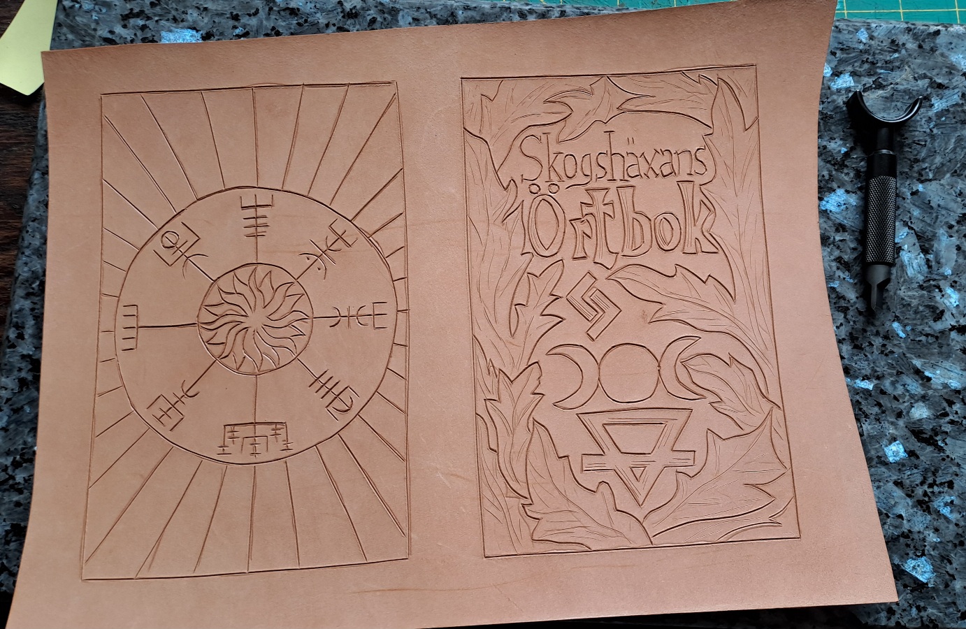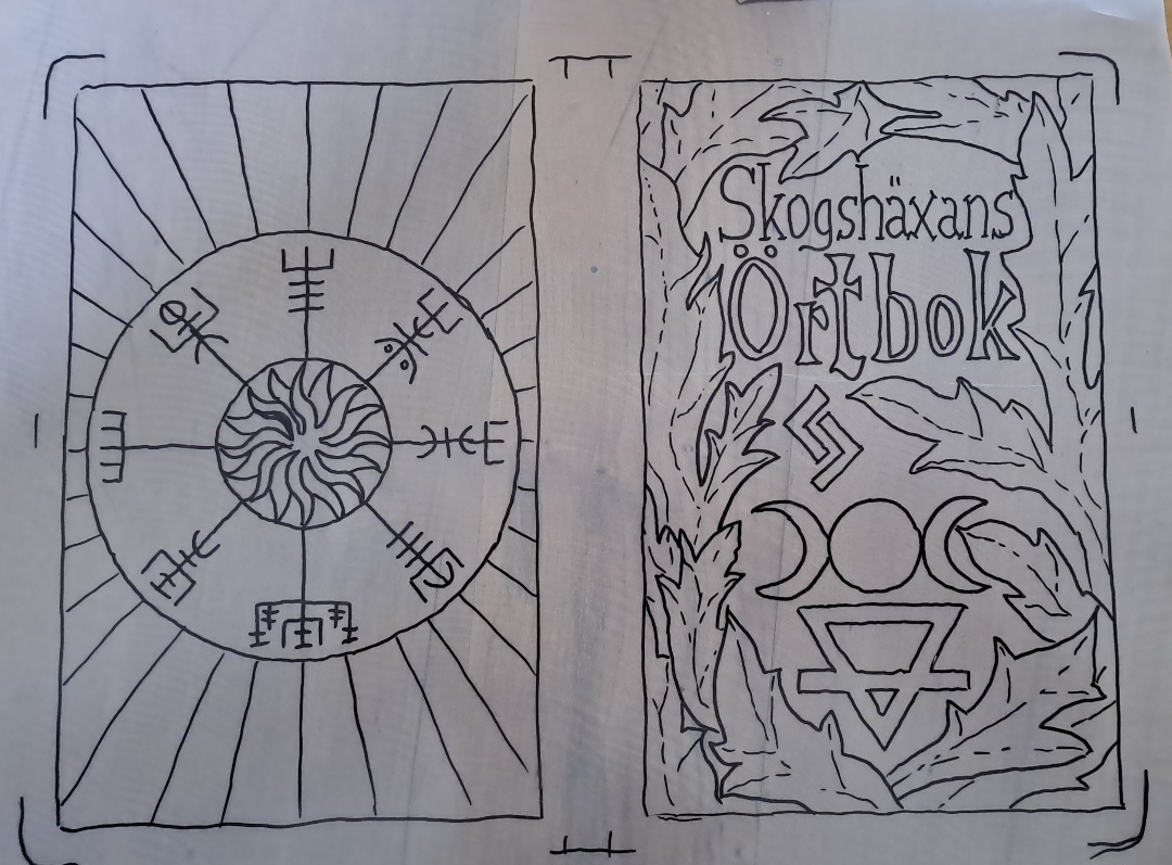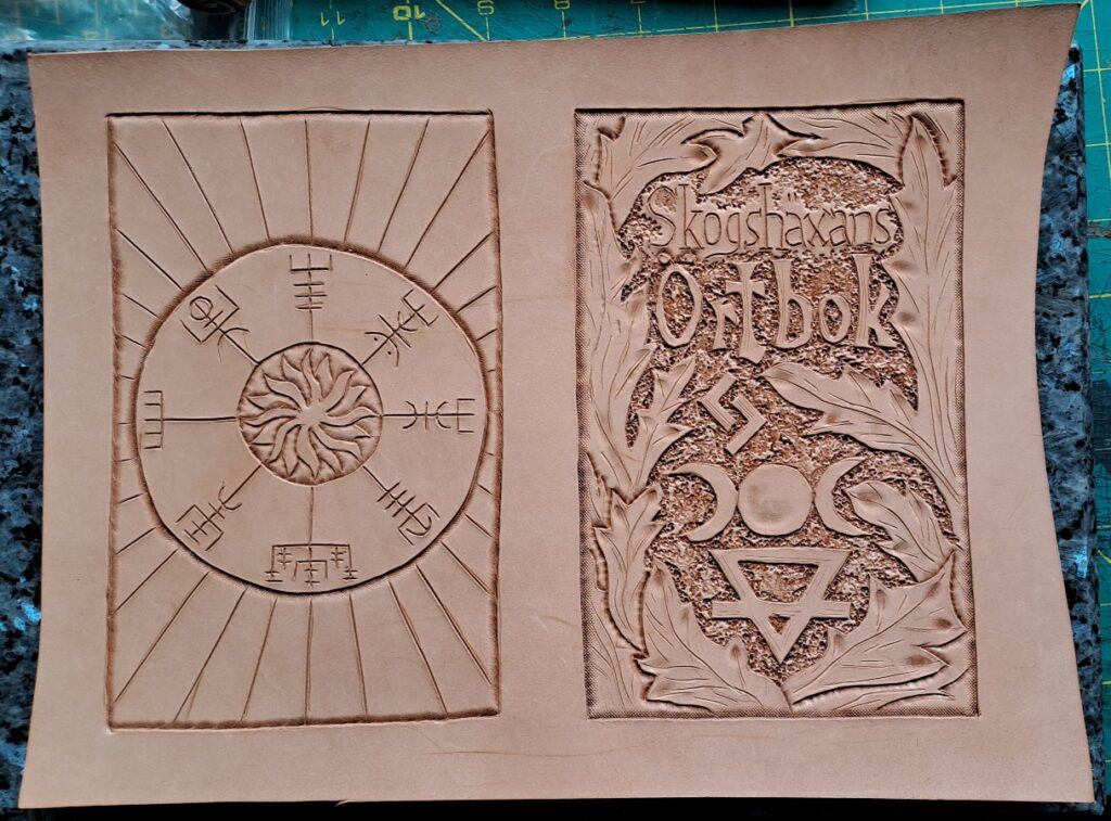 The most nerve-wracking but rewarding part was the tooling. I wanted this to be unmistakably hers. On the front, I carefully carved and stamped the title: ‘Skogshäxans Örtbok’.