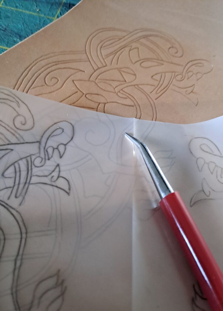 Next, I “cased” the veg-tan leather—dampening it with water to open up the fibers. While still damp, I laid the tracing paper onto the surface and carefully transferred the design using a stylus. The pattern was now a faint outline on the damp leather canvas.