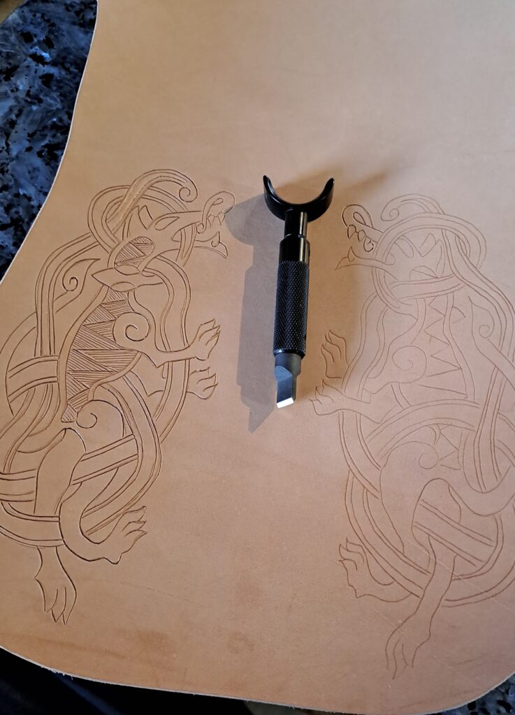 This is where the precision comes in. I picked up my swivel knife—a specialized leather carving tool—and slowly, deliberately cut the main lines of the ornament. The feeling of the sharp blade gliding through the damp leather, creating that first clean incision, is incredibly satisfying.