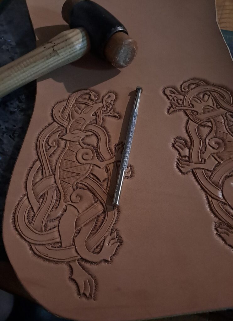 After cutting the lines, I used a set of small tooling stamps (specifically a beveler to push down one side of the cuts) to give the design depth and dimension. This makes the knotwork appear raised, casting subtle shadows that define the artwork. I let the leather dry completely, hardening the design into the material forever.
