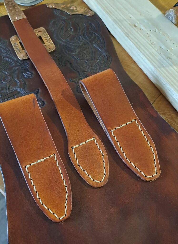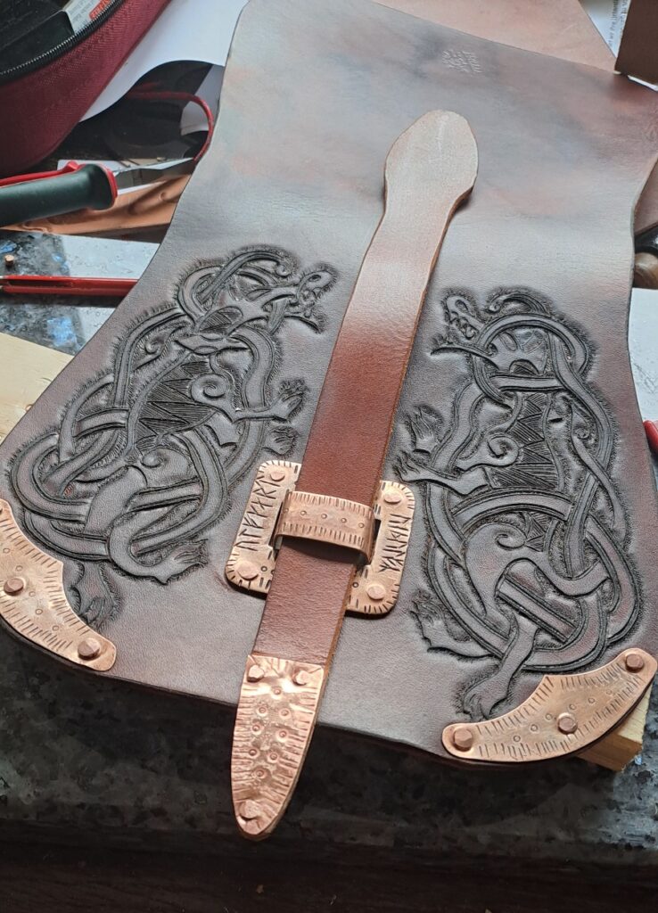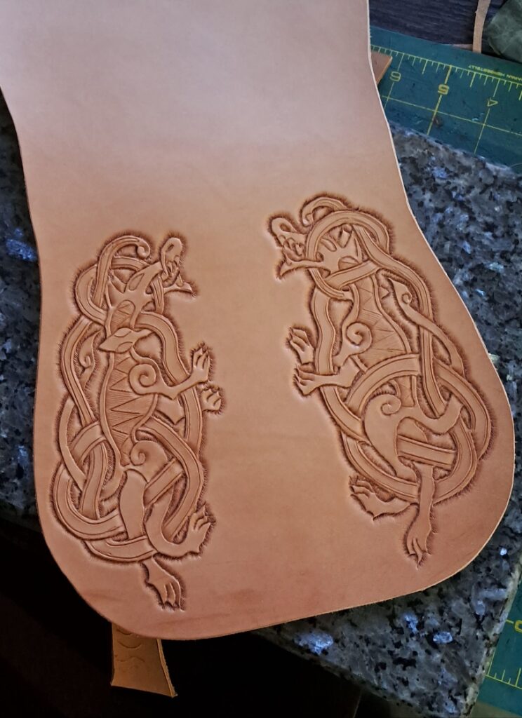 Once the tooling was set and dry, I applied a dark brown dye. The dark finish fills the deep cuts of the ornament, making the design pop with contrast.