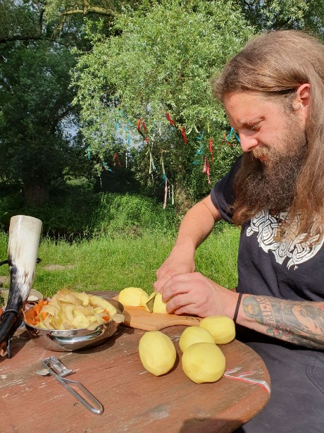 With the prep finished, I swept the ingredients into the cauldron hanging over the crackling fire. There is a primitive satisfaction in that sound—the splash of fresh ingredients hitting the water followed by the steady roar of the flames.
